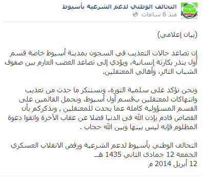 أصدر تحالف دعم الشرعية ورفض الانقلاب في محافظة أسيوط بيانا – نشر عبر موقع التواصل الاجتماعي فيس بوك – أوضح فيه أن تصاعد حالات التعذيب في السجون بمدينة أسيوط خاصة قسم أول "ينذر بكارثة إنسانية"، ويؤدي إلى "تصاعد الغضب العارم بين صفوف الشباب الثائر، وأهالي المعتقلين".