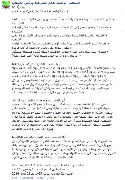 وأضاف البيان أن "سلطات الانقلاب تخدع المواطنين ، حيث أنه لا يوجد أى خدمات ولا صحة ، ولا أمن وأمان، و لا عدل ولا مساواة، لا تعليم ولا أخلاق، لا سياسة ولا اقتصاد، لا ديمقراطية ولا إرادة شعبية، لا حقوق ولا حريات، ولا استقرار ولا دولة، وإنما يوجد عصابة تسرق وتنهب ثروات البلاد، وأن العصابة التي قامت بانقلاب عسكري ضد أول رئيس مدني منتخب، تحول مصر إلي تكية ، وأصبحت تهمين على كل شيء، وحولت مصر إلى مال عام سائب بدون صاحب".