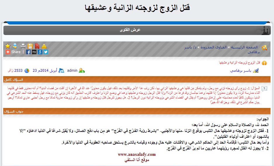 وكانت نص فتوى «برهامي» المنشورة على موقع «أنا السلفي» كالتالي: «لا يجوز ذلك إلا إذا رأى الفرج في الفرج وأما بعد حال التلبس، فإقامة الحد إلى الحاكم الشرعي، والافتئات عليه حال وجوده وقيامه بالشرع يستحق صاحبه العقوبة في الدنيا والآخرة ولا يجوز له القتل لمجرد رؤيتهما عاريين ما لم يرَ الفَرْج في الفَرْج».