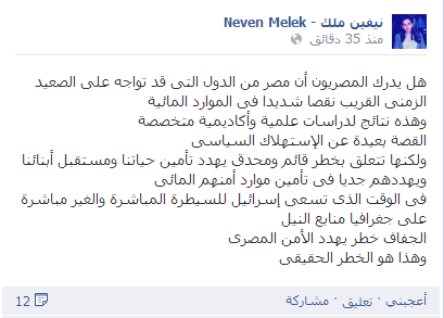 أكدت نيفين ملك الناشطة الحقوقية، وعضو جبهة الضمير الوطني، في تصريحات نشرت عبر صفحتها الشخصية على موقع التواصل الاجتماعي "فيس بوك" أن مصر مهددة  بخطر الجفاف، وستكون من الدول التي ستعاني من نقص في مواردها المائية.