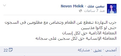 أضافت ملك في تدوينة على صفحتها الشخصية بموقع التواصل الاجتماعي فيس بوك أن هناك كثير من المظلومين يجب التضامن معهم داخل السجون وأن المعاملة الآدمية حق لكل إنسان حتى ولو كان مذنبا وأن لكل سجين ومعتقل الحق في معاملة آدمية تليق به .