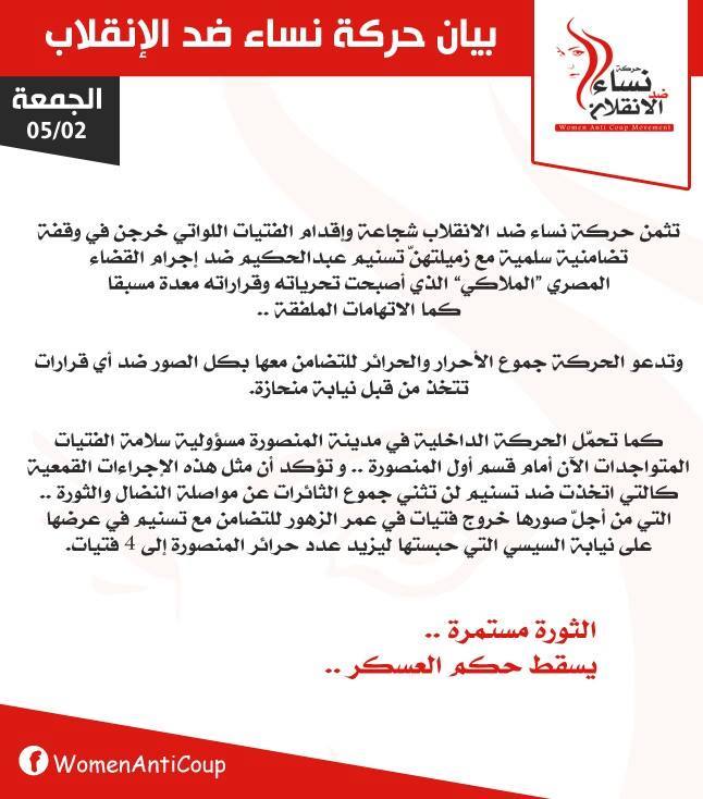 أصدرت حركة "نساء ضد الانقلاب" بيانا أمس الجمعة، تثمن فيه "شجاعة وإقدام" الفتيات اللواتي خرجن في وقفة تضامنية سلمية مع زميلتهنّ تسنيم عبد الحكيم، ضد إجرام القضاء المصري "الملاكي الذي أصبحت تحرياته وقراراته معدة مسبقا كما الاتهامات الملفقة" – على حد وصف البيان