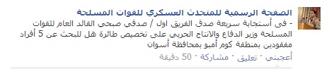 وأضاف المتحدث العسكري على الصفحة الرسمية له على موقع التواصل الاجتماعي "فيس بوك " "فى أستجابة سريعة صدق الفريق اول / صدقي صبحي القائد العام للقوات المسلحة وزير الدفاع والانتاج الحربي على تخصيص طائرة هل للبحث عن 5 أفراد مفقودين بمنطقة كوم أمبو بمحافظة أسوان".