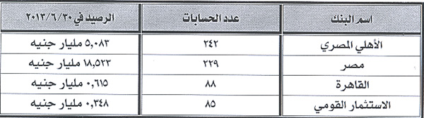 وجاء في الملحوظة الثالثة أنه لم يتم الالتزام بتحويل كافة الأرصدة النقدية للصناديق والحسابات الخاصة الموجودة بالبنوك التجارية لحساب الخزانة الموحد بالبنك المركزي الأمر الذي ترتب عليه تضخم أرصدة الصناديق والحسابات الخاصة التابعة للوزارات والمحافظات والهيئات المختلفة دون الاستفادة منها في تسديد عجز الموازنة، مشيرة إلى أن معظم الصناديق والحسابات الخاصة جمدت حسابات وأرصدتها في شكل ودائع بنكية بما لا يتماشى مع الغاية المكونة من أجلها تلك الصناديق.