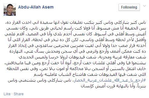 وقال عاصم: "النهاردة شفت مفارقة غريبة ومحزنة، شفت فيديوهات لروﻻ خرسا ولميس الحديدي بيشتموا فيا وفي أهلي علشان خفت أرجع، أيوة أنا خفت أرجع ومين فينا مابيخافش، خايف اعتقل بالسنين أو اتسجن بلا محاكمة أو أموت بلا تمن، وفي نفس اللحظة اللي شفت فيها الفيديوهات شفت هاشتاج الشباب عاملينه باسم #ارجع_يا_عبد_الله_علشان_عربية_الخضار، ناس بتباركلي وناس بتشتمني وناس بتتريأ وأنا بالنهاية قررت أعيش كإنسان".