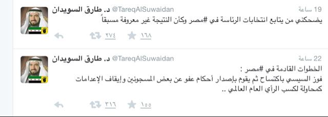 وبين السويدان في سلسلة من التغريدات على صفحته بموقع التواصل الاجتماعي "تويتر": "الخطوات القادمة في مصر: فوز السيسي باكتساح ثم يقوم بإصدار أحكام عفو عن بعض المسجونين وإيقاف الإعدامات كمحاولة لكسب الرأي العام العالمي."