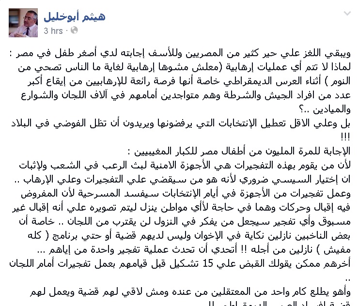 وتسائل أبو خليل فى تدوينة عبر صفحته على "فيس بوك":لماذا لا تتم أي عمليات إرهابية (معلش مشوها إرهابية لغاية ما الناس تصحي من النوم ) أثناء العرس الديمقراطي خاصة أنها فرصة رائعة للإرهابيين من إيقاع أكبر عدد من أفراد الجيش والشرطة وهم متواجدين أمامهم في آلاف اللجان والشوارع والميادين وتعطيل الانتخابات التي يرفضونها ويريدون أن تظل الفوضي في البلاد؟".