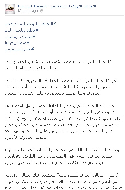 ثمن "التحالف الثوري لنساء مصر" المقاطعة الشعبية الكبيرة التي شهدتها المسرحية الهزلية "رئاسة الدم"؛ حيث أظهر الشعب المصري وعيا حقيقيا باستخفافه بتلك الانتخابات العبثية.