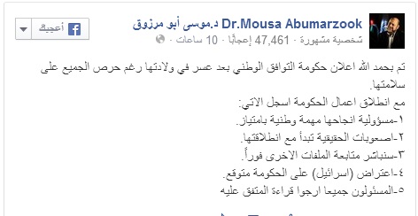 وأضاف "أبو مرزوق" على صفحته بموقع التواصل الاجتماعي "فيس بوك"، اليوم الثلاثاء، "تم إعلان حكومة التوافق الوطني بعد عسر في ولادتها رغم حرص الجميع على سلامتها"، مضيفًا أن الصعوبات الحقيقة أمام الحكومة تبدأ مع انطلاقتها.