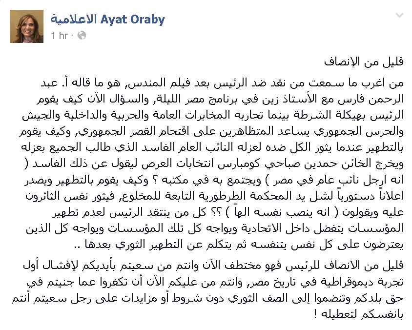 واختتمت: قليل من الإنصاف للرئيس فهو مختطف الآن وانتم من سعيتم بأيديكم لإفشال أول تجربة ديمقراطية في تاريخ مصر, وانتم من عليكم الآن أن تكفروا عما جنيتم في حق بلدكم وتنضموا إلى الصف الثوري دون شروط أو مزايدات على رجل سعيتم أنتم بأنفسكم لتعطيله !.