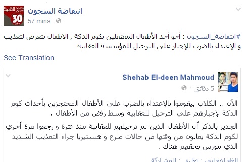 وأضاف فى تدوينة عبر صفحته على فيس بوك ونشرتها الصفحة الرسمية لانتفاضة السجون أن الأطفال أن الأطفال الذين تم ترحيلهم للمؤسسة العقابية ورجعوا لكوم الدكة يعانون من وقتها من حالات صرع وهيستريا جراء التعذيب الشديد الذى مورس عليهم".