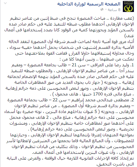 نشرت الصفحة الرسمية لوزارة الداخلية على موقع التواصل الاجتماعي "فيس بوك"، تدوينة عن الطالبين باتحاد هندسة المنصورة "وليد السمري" و"مصطفى عبد الحي"، تقول خلالها إنهما تم القبض عليهما وبحوزتهما "حقيبة سوداء بها كمية من الوقود، زعمت أنهما اعترفا باستخدامها في أعمال عنف بتكليف من قيادات إخوانية، بالإضافة أيضاً إلى أموال اعترفوا،