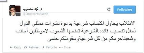 وقال محسوب فى تغريدة عبر صفحته على "تويتر":"الانقلاب يحاول اكتساب شرعية بدعوة عشرات ممثلي الدول لحفل تنصيب قائده.الشرعية تمنحها الشعوب لا موظفين أجانب وشعبنا حرمكم من كل شرعية وسقوطكم حتمي".