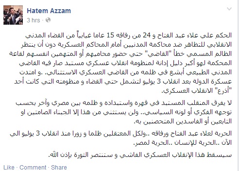 وأضاف عزام فى تدوينة عبر "فيس بوك":"الحكم علي علاء عبد الفتاح و 24 من رفاقه 15 عاما غيابياً من القضاء المدني الانقلابي للتظاهر ضد محاكمة المدنيين أمام المحاكم العسكرية دون أن ينتظر الظالم المسمي خطأ "القاضي" حتي حضور محاميهم أو المتهمين أنفسهم لقاعة المحكمة لهو أكبر دليل إدانة لمنظومة انقلاب عسكري مستبد صار فيه القاضي المدني الطبيعي أبشع في ظلمه من القاضي العسكري الاستثنائي.و امتدت عسكرة الدولة بعد انقلاب 3 يوليو لتشمل حتي القضاء و منظومته التي كانت أحد "أذرع" الانقلاب العسكري.