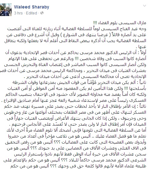 طالب المستشار وليد شرابي -المتحدث الرسمي باسم حركة قضاة من أجل مصر- بمحاكمة قائد الانقلاب عبد الفتاح السيسي لاغتصاب أنصاره لفتيات بميدان التحرير، خلال حفل تنصيبه رئيسا بعد فوزه بانتخابات العسكر، كما يُحَاسَب الرئيس محمد مرسي عن أحداث الاتحادية.