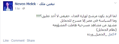 وقالت ملك في تدوينة لها عبر صفحتها على موقع التواصل الاجتماعي "فيس بوك": "لما الزند يكون مرشح لوزارة العدل، حقيقى لا أجد تعليق؟!!!!".