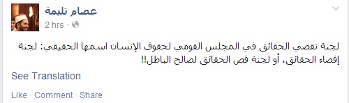 وقال تليمة فى تدوينة عبر "فيس بوك": لجنة تقصي الحقائق في المجلس القومي لحقوق الإنسان اسمها الحقيقي: لجنة إقصاء الحقائق، أو لجنة قص الحقائق لصالح الباطل!!".