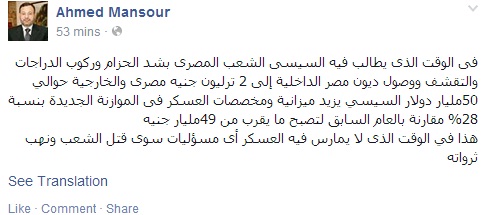 وقال منصور عبر صفحته على "فيس بوك": فى الوقت الذى يطالب فيه السيسى الشعب المصرى بشد الحزام وركوب الدراجات والتقشف ووصول ديون مصر الداخلية إلى 2 ترليون جنيه مصرى والخارجية حوالي 50مليار دولار السيسي يزيد ميزانية ومخصصات العسكر فى الموازنة الجديدة بنسبة 28% مقارنة بالعام السابق لتصبح ما يقرب من 49مليار جنيه".