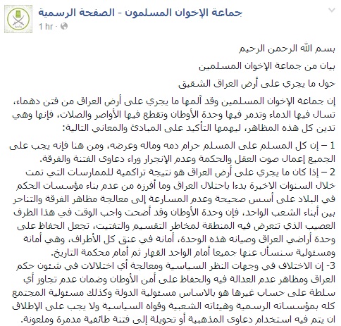 أدانت جماعة الإخوان المسلمين ما يجري على أرض العراق من فتن دهماء، تسال فيها الدماء وتدمر فيها وحدة الأوطان وتقطع فيها الأواصر والصلات.