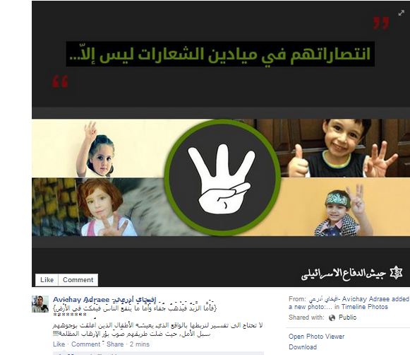 قام المتحدث باسم الجيش الصهيوني أفيخاي أدرعي عبر حسابه الرسمي بموقع التواصل الاجتماعي "فيس بوك" بنشر آيات قرآنية للرد على فرحة الفلسطينيين بخطف الجنود الإسرائيليين الثلاثة في الضفة الغربية.
