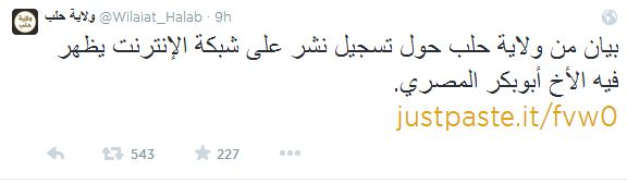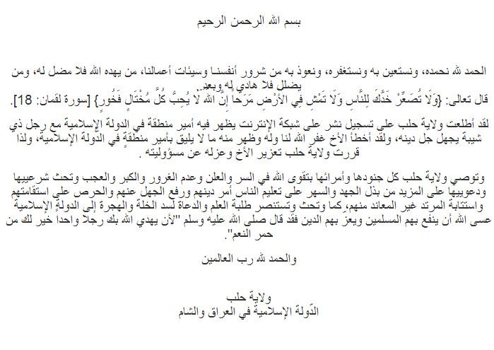 وقال بيان منشور على الحساب الرسمي لفرع "داعش" في محافظة حلب: "لقد اطلعت ولاية حلب على تسجيل نشر على شبكة الإنترنت يظهر فيه أمير منطقة في الدولة الإسلامية مع رجل ذي شيبة يجهل جل دينه، ولقد أخطأ الأخ غفر الله لنا وله وظهر منه ما لا يليق بأمير منطقةٍ في الدّولة الإسلامية، ولذا قررت ولاية حلب تعزير الأخ وعزله عن مسؤوليته".
