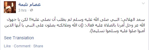 وقال تليمة فى تدوينة عبر صفحته على "فيس بوك":"سعد الهلالي: النبي صلى الله عليه وسلم لم يطلب أن نصلي عليه!! لكن يا جهول الله عز وجل أمرنا بالصلاة عليه فقال: (إن الله وملائكته يصلون على النبي يا أيها الذين آمنوا صلوا عليه وسلموا تسليما)".