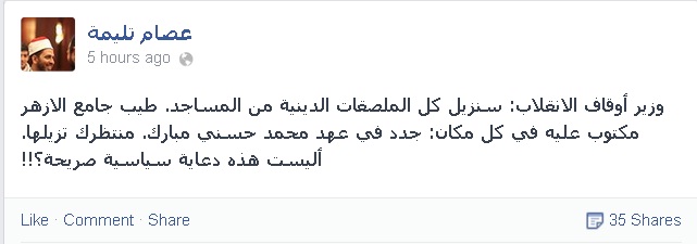 وقال تليمة -في تدوينة عبر صفحته على موقع التواصل الاجتماعي "فيس بوك": "وزير أوقاف الانقلاب: سنزيل كل الملصقات الدينية من المساجد. طيب جامع الأزهر مكتوب عليه في كل مكان: جدد في عهد محمد حسني مبارك. منتظرك تزيلها. أليست هذه دعاية سياسية صريحة؟!!".