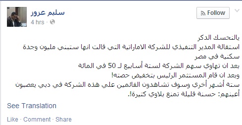 وقال عزوز فى تدوينة عبر صفحته على موقع التواصل الاجتماعي "فيس بوك": "بعد أن تهاوي سهم الشركة لستة أسابيع لـ 50 في المائة وبعد أن قام المستثمر الرئيس بتخفيض حصته!، ستة أشهر أخرى وسوف تشاهدون القائمين على هذه الشركة في دبي يعصبون أعينهم: حسنة قليلة تمنع بلاوي كتيرة!".