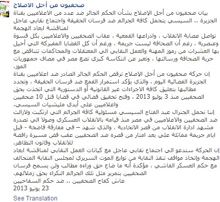 وجددت الحركة، فى بيان لها، مطالبها بتعليق كافة الإجراءات غير القانونية أو الدستورية التي اتخذت بحق الصحفيين منذ 3 يوليو 2013 ، وفتح تحقيق قضائي في قضايا قتل 10 صحفيين وإعلاميين على أيدي مليشيات السيسي.