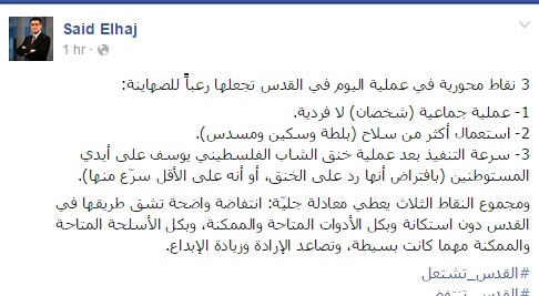 وأوضح الحاج، أن "مجموع النقاط الثلاث يعطي معادلة جليّة: انتفاضة واضحة تشق طريقها في القدس دون استكانة وبكل الأدوات المتاحة والممكنة، وبكل الأسلحة المتاحة والممكنة مهما كانت بسيطة، وتصاعد الإرادة وزيادة الإبداع".