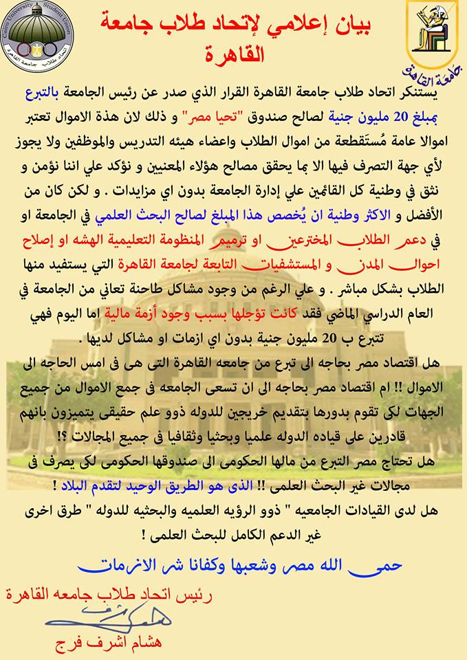 واختتم البيان قائلاً، "هل اقتصاد مصر بحاجه إلى تبرع من جامعة القاهرة التي هي في أمس الحاجة إلى الاموال!! أم اقتصاد مصر بحاجة إلى أن تسعى الجامعة في جمع الأموال من جميع الجهات لكى تقوم بدورها بتقديم خريجين للدولة ذوو علم حقيقي يتميزون بأنهم قادرين على قيادة الدولة علميا وبحثيا وثقافيا في جميع المجالات ؟! هل تحتاج مصر التبرع من مالها الحكومي إلى صندوقها الحكومي لكي يصرف في مجالات غير البحث العلمي!! الذي هو الطريق الوحيد لتقدم البلاد !هل لدى القيادات الجامعيه" ذوو الرؤيه العلميه والبحثيه للدوله "طرق أخرى غير الدعم الكامل للبحث العلمي".