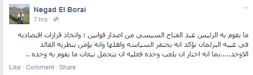 وأضاف البرعى في تدوينة عبر صفحته على موقع التواصل الاجتماعي "فيس بوك": "ما يقوم به الرئيس عبد الفتاح السيسي من إصدار قوانين، واتخاذ قرارات اقتصاديه في غيبه البرلمان؛ تؤكد انه يحتقر السياسة وأهلها وأنه يؤمن بنظريه القائد الأوحد".