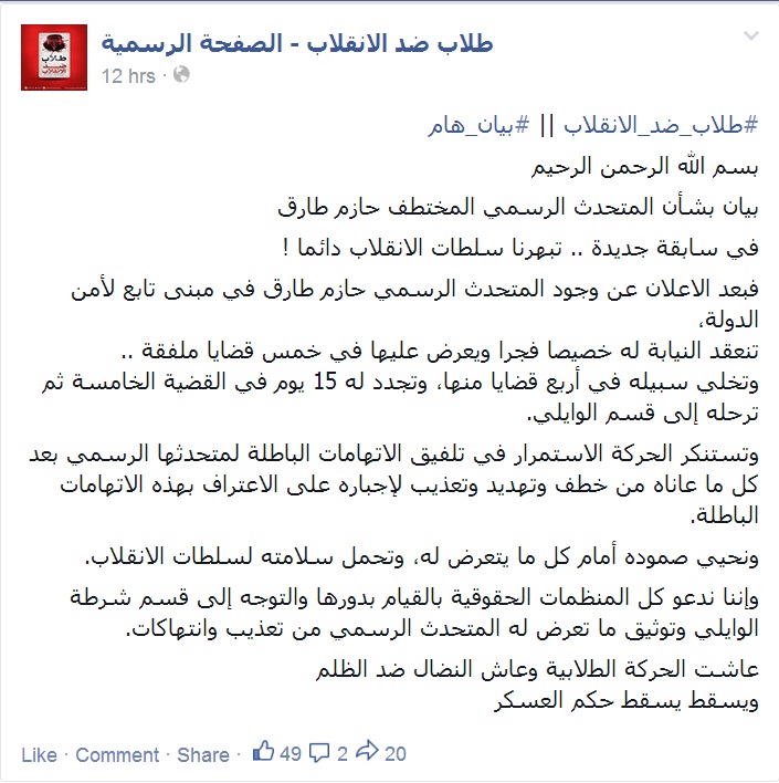 استنكرت حركة طلاب ضد الانقلاب استمرار سلطات الانقلاب في تلفيق الاتهامات الباطلة لمتحدثها الرسمي بعد كل ما عاناه من خطف وتهديد وتعذيب ﻹجباره على الاعتراف بهذه الاتهامات الباطلة، مثمنة صموده أمام كل ما يتعرض له، ومحملة سلامته لسلطات الانقلاب.