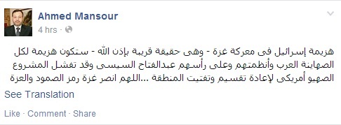 وأضاف منصور في تدوينة عبر صفحته على موقع التواصل الاجتماعي "فيس بوك": هزيمة إسرائيل في معركة غزة – وهي حقيقة قريبة بإذن الله – ستكون هزيمة لكل الصهاينة العرب وأنظمتهم، وعلى رأسهم عبد الفتاح السيسي، وقد تفشل المشروع الصهيوأمريكي لإعادة تقسيم وتفتيت المنطقة".