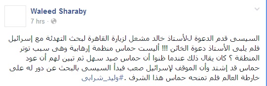 وقال شرابى، فى تدوينة عبر صفحته على "فيس بوك": "السيسى قدم الدعوة للأستاذ خالد مشعل لزيارة القاهرة لبحث التهدئة مع إسرائيل فلم يلبى الأستاذ دعوة الخائن !!! أليست حماس منظمة إرهابية وهى سبب توتر المنطقة ؟".