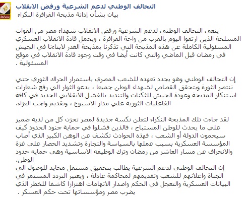 وأضاف التحالف :"لقد جاءت تلك المذبحة النكراء لتعلن نكسة جديدة لمصر تحزن كل من لديه ضمير علي ما يحدث للوطن المستباح ، فالذين فشلوا في حماية جنود الحدود كيف سيحمون الدولة أو الشعب ، فهذه الحوادث تكشف عن الوهن الكبير الذي أصاب المؤسسة العسكرية بسبب عملها بالسياسة والتجارة وتشديد الحصار علي غزة والانحراف عن مسار العاشر من رمضان وترك الوظيفة الأساسية وهي حماية حدود الوطن.