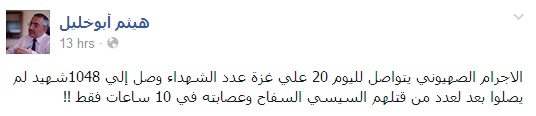 وقال أبو خليل: الإجرام الصهيوني يتواصل لليوم 20 علي غزة عدد الشهداء وصل إلي 1048شهيد لم يصلوا بعد لعدد من قتلهم السيسي السفاح وعصابته في 10 ساعات فقط !!.