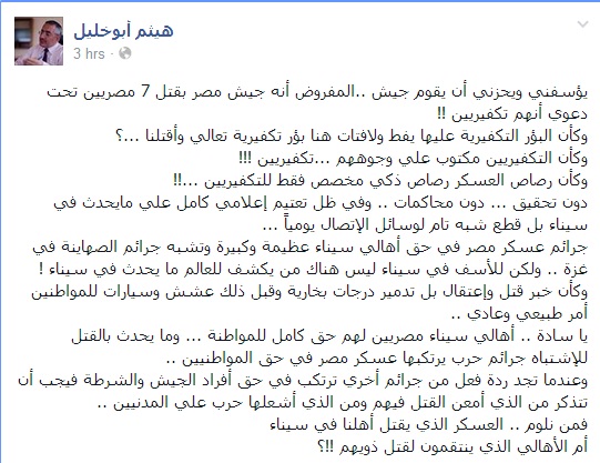 وأضاف أبو خليل فى تدوينة عبر صفحته على "فيس بوك": وكأن البؤر التكفيرية عليها يفط ولافتات هنا بؤر تكفيرية تعالي واقتلنا؟، وكأن التكفيريين مكتوب علي وجوههم …تكفيريين !!!.. وكأن رصاص العسكر رصاص ذكي مخصص فقط للتكفيريين …!!.. دون تحقيق … دون محاكمات .. وفي ظل تعتيم إعلامي كامل علي ما يحدث في سيناء بل قطع شبه تام لوسائل الاتصال يومياً .