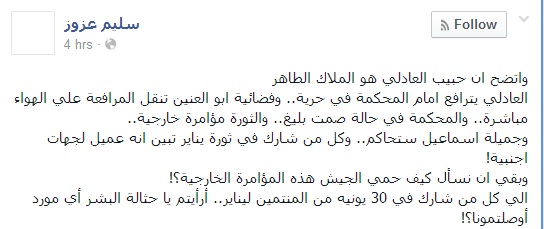 وتابع عزوز: "العادلي يترافع أمام المحكمة في حرية.. وفضائية أبو العنين تنقل المرافعة علي الهواء مباشرة.. والمحكمة في حالة صمت بليغ.. والثورة مؤامرة خارجية، وجميلة إسماعيل ستحاكم.. وكل من شارك في ثورة يناير تبين أنه عميل لجهات أجنبية!".