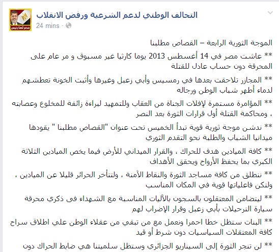 أعلن التحالف الوطنى لدعم الشرعية ورفض الانقلاب تدشين موجة ثورية قوية "هادرة" تبدأ الخميس 14 أغسطس تحت عنوان "القصاص مطلبنا " إيذانا ببدء الموجة الثورية الرابعة، مجددا الدعوة للشباب والطلبة لتصدر القيادة الميدانية للحراك الثوري وإحراز تقدم ثوري مناسب للحدث والظروف وتطلعات الشعب وفي القلب منهم أسر الشهداء دون تجاوز لثوابت الحراك.