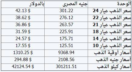 أما سعر الذهب عيار 18 سجل حوالى 225.91جنيه و بلغ سعر جنيه الذهب حوالى 2108.56جنيه و سجل سعر كيلو الذهب301211.51جنيه فى المتوسط.