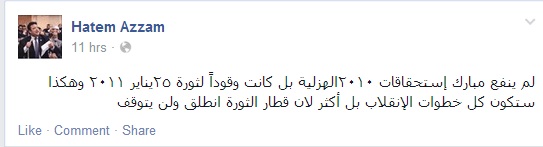 وتابع عزام: "لم ينفع مبارك استحقاقات ٢٠١٠ الهزلية بل كانت وقوداً لثورة ٢٥ يناير ٢٠١١ وهكذا ستكون كل خطوات الانقلاب بل أكثر لان قطار الثورة انطلق ولن يتوقف".