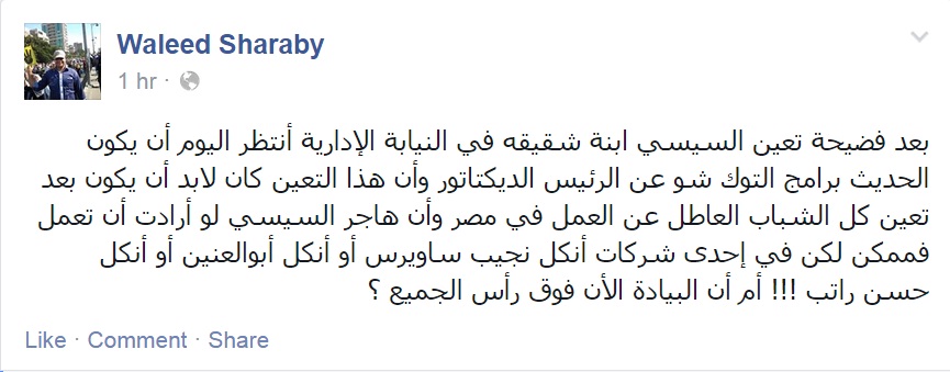 وقال شرابى فى تدوينة عبر صفحته على "فيس بوك":"بعد فضيحة تعيين السيسي ابنة شقيقه في النيابة اﻹدارية أنتظر اليوم أن يكون الحديث برامج التوك شو عن الرئيس الديكتاتور وأن هذا التعين كان ﻻبد أن يكون بعد تعين كل الشباب العاطل عن العمل في مصر وأن هاجر السيسي لو أرادت أن تعمل فممكن لكن في إحدى شركات أنكل نجيب ساويرس أو أنكل أبو العنين أو أنكل حسن راتب" .