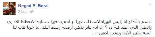 وقال البرعى فى تدوينة عبر صفحته على "فيس بوك": اقسم بالله لو أنا رئيس الوزراء لاستقلت فورا أو انتحرت فورا ".