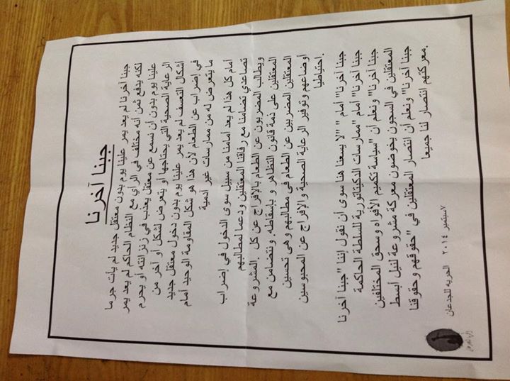 وطالبت الحملة بتحسين الرعاية الصحية المعتقلين المضربين عن الطعام و إيقاف التعذيب تجاه المعتقلين السياسين حيثقررأعضاء الحملة في الدخول في إضراب تصاعدي تضامنًا مع المعتقلين المضربين حتى يفرجوا عن المعتقلين على ذمة قانون التظاهر،وإسقاطه، والإفراج عن المحبوسين احتياطيًا.