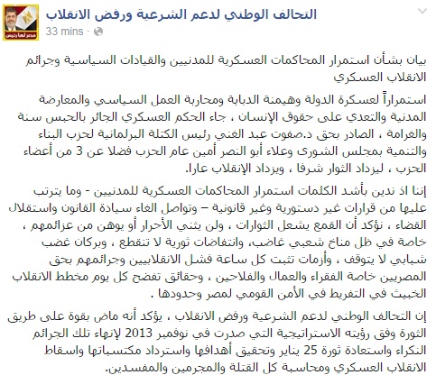 وأدان التحالف "استمرار المحاكمات العسكرية للمدنيين – وما يترتب عليها من قرارات غير دستورية وغير قانونية – وتواصل إلغاء سيادة القانون واستقلال القضاء"، مؤكدا أن "القمع يشعل الثورات ، ولن يثني الأحرار أو يوهن من عزائمهم ، خاصة في ظل مناخ شعبي غاضب، وانتفاضات ثورية لا تنقطع ، وبركان غضب شبابي لا يتوقف ، وأزمات تثبت كل ساعة فشل الانقلابيين وجرائمهم بحق المصريين خاصة الفقراء والعمال والفلاحين ، وحقائق تفضح كل يوم مخطط الانقلاب الخبيث في التفريط في الأمن القومي لمصر وحدودها" .