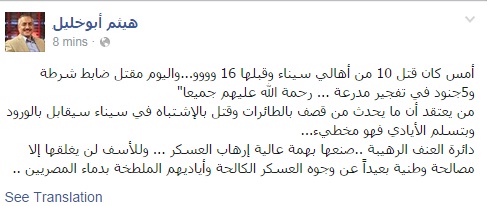 وتابع : "أمس كان قتل 10 من أهالي سيناء وقبلها 16 وووو…واليوم مقتل ضابط شرطة و5 جنود في تفجير مدرعة … رحمة الله عليهم جميعا".