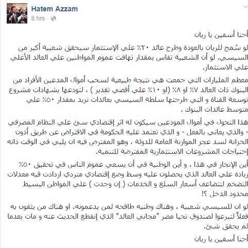 قال حاتم عزام القيادى بحزب الوسط إن معظم المليارات التي جمعت هي نتيجة طبيعية لسحب أموال المدعين الأفراد من البنوك ذات العائد ٧٪ او ٨٪ (او ١٠٪ علي أقصي تقدير ) ، لتودعها بشهادات مشروع توسعة القناة و التي طرحتها سلطة السيسي بعائدات تزيد بمقدار ٥٠٪ علي متوسط عائدات البنوك .
