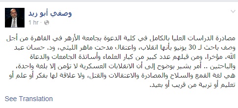 وأضاف أبو زيد فى تدوينة عبر صفحته على "فيس بوك" أن " مصادرة الدراسات العليا بالكامل في كلية الدعوة بجامعة الأزهر في القاهرة من أجل وصف باحث لـ 30 يونيو بأنها انقلاب، واعتقال مدحت ماهر الليثي، ود. حسان عبد الله، مؤخرا، ومن قبلهم عدد كبير من كبار العلماء وأساتذة الجامعات والدعاة والباحثين أمر يشير بوضوح إلى أن الانقلابات العسكرية لا تؤمن إلا بلغة واحدة، هي لغة القمع والسلاح والمصادرة والاعتقالات والقتل، ولا علاقة لها بفكر أو علم أو تعليم أو تربية من قريب أو بعيد".
