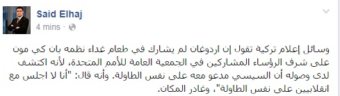 وقال الحاج في تدوينه على صفحته على موقع التواصل الاجتماعي "فيس بوك": "وسائل إعلام تركية تقول إن أردوغان لم يشارك في طعام غداء نظمه بان كي مون، على شرف الرؤساء المشاركين في الجمعية العامة للأمم المتحدة، لأنه اكتشف لدى وصوله أن السيسي مدعو معه على نفس الطاولة، وأنه قال: "أنا لا اجلس مع انقلابيين على نفس الطاولة"، وغادر المكان".